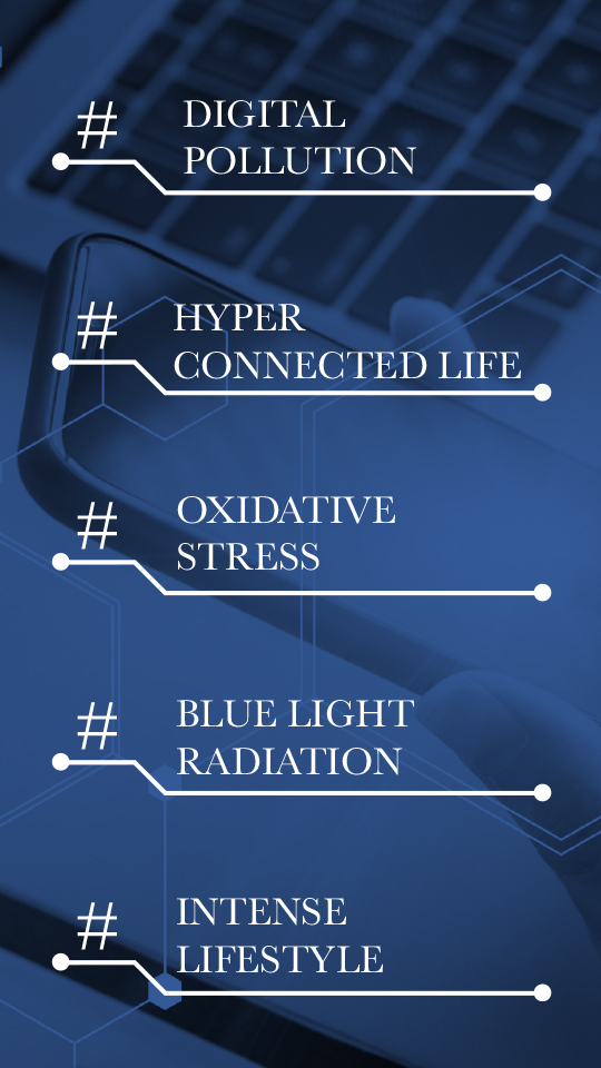 On average, each adult spends 12 hours a day in front of 3 different devices and, consequently, to excessive exposure to blue light, emitted by electronic devices such as PCs, tablets, smartphones, LED and cold light lamps, which generates free radicals. responsible for oxidative stress and skin aging.